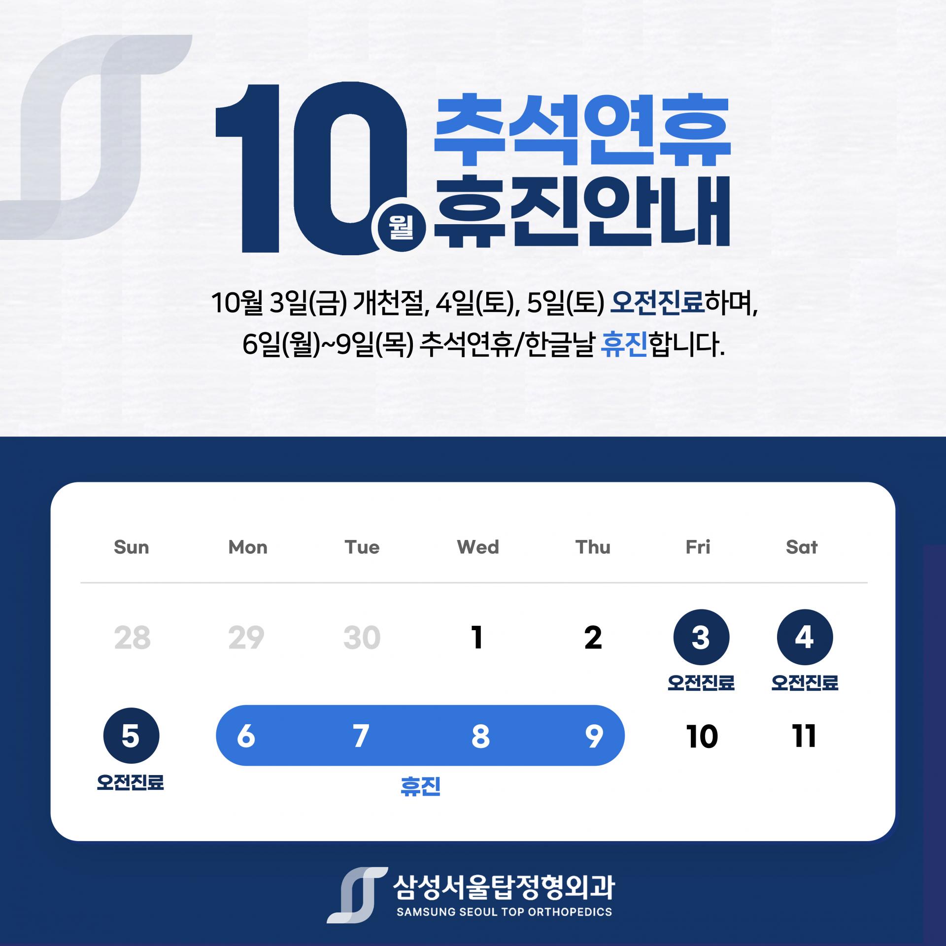 삼성서울탑정형외과 10월 추석연휴 진료안내